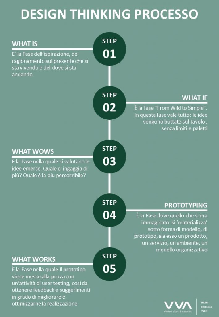 “Quattro sono le fasi di questo approccio. La prima è chiamata WHAT IS: è il momento dell’ispirazione, il momento in cui si ragiona sul momento presente, quello che si sta vivendo e dove si sta andando. A questa fase segue quella chiamata WHAT IF, e qui vale tutto: si buttano sul campo le idee senza paura e senza remore, come dicono gli americani From wild to simple. Una volta che tutte le idee sono sul tavolo, ecco che si passa al WHAT WOWS: quale, tra tutte le idee emerse, ci piace davvero tanto ed allo stesso tempo ci sembra percorribile? E alla fine, eccoci alla fase chiamata prototyping, quella in cui si mette in concreto tutto quello che si era immaginato e si costruisce con le mani un vero e proprio modello, con carta, forbici, colla e tutti gli oggetti che si hanno a disposizione e si prova quindi a ‘materializzare’ un prodotto, un servizio, un ambiente, un modello organizzativo.